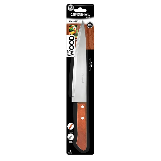 As facas da linha Wood da Original Line, tem tudo para deixar a sua cozinha completa pois é indicada para auxiliar no preparo de suas receitas. Fabricada em lâmina de aço inox com cabo em madeira que facilita o manuseio e a limpeza. Indicada para corte de carnes, legumes e frutas.